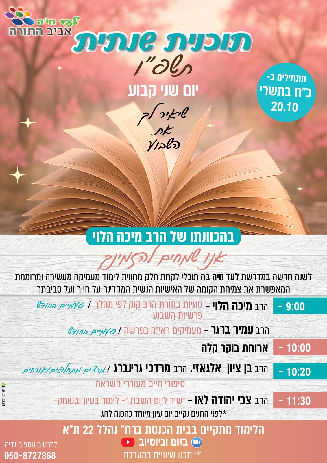 השיעורים מתקיימים במדרשת לעד-חיה אביב התורה. ברחוב נהלל 22, תל אביב.